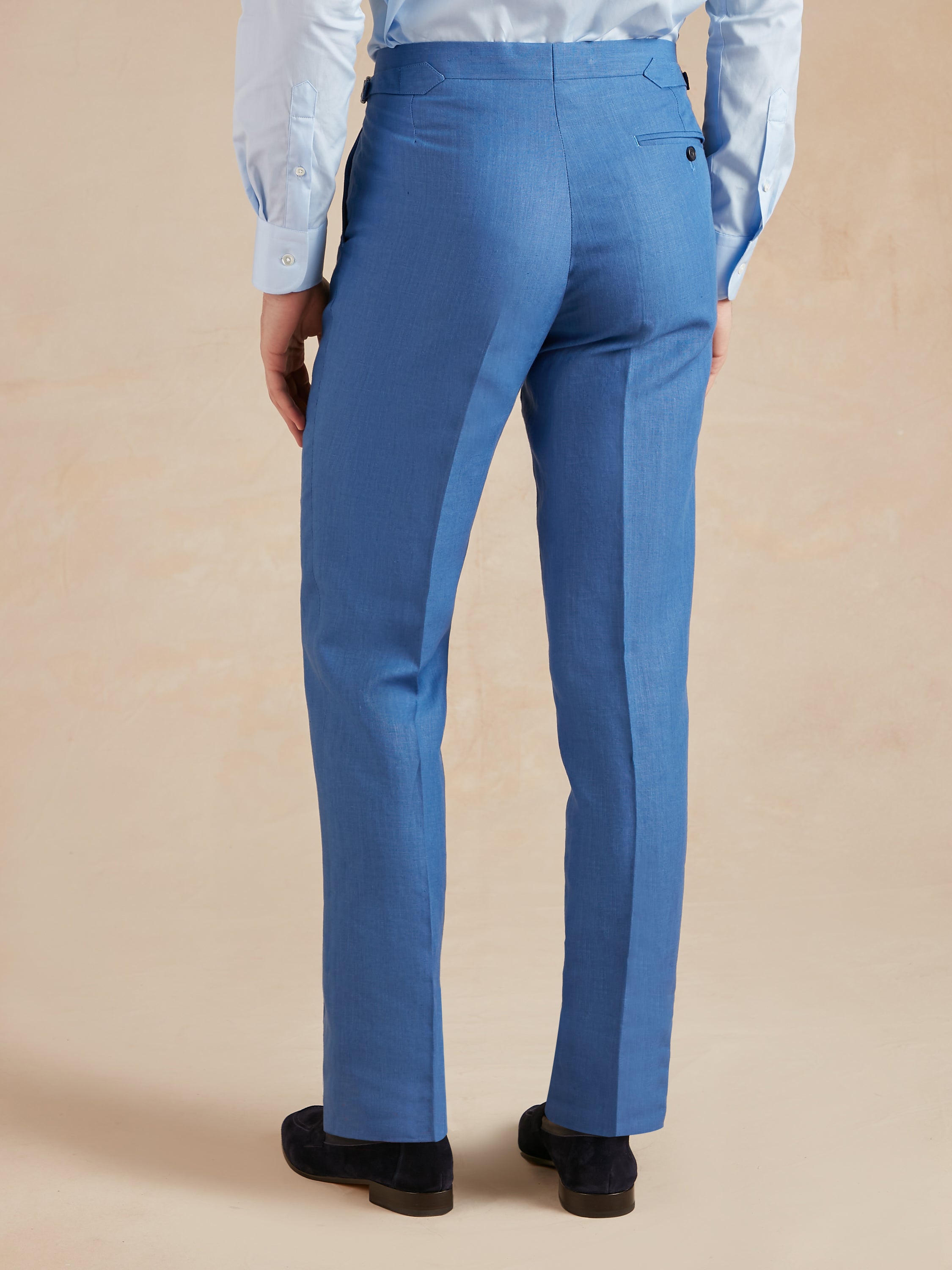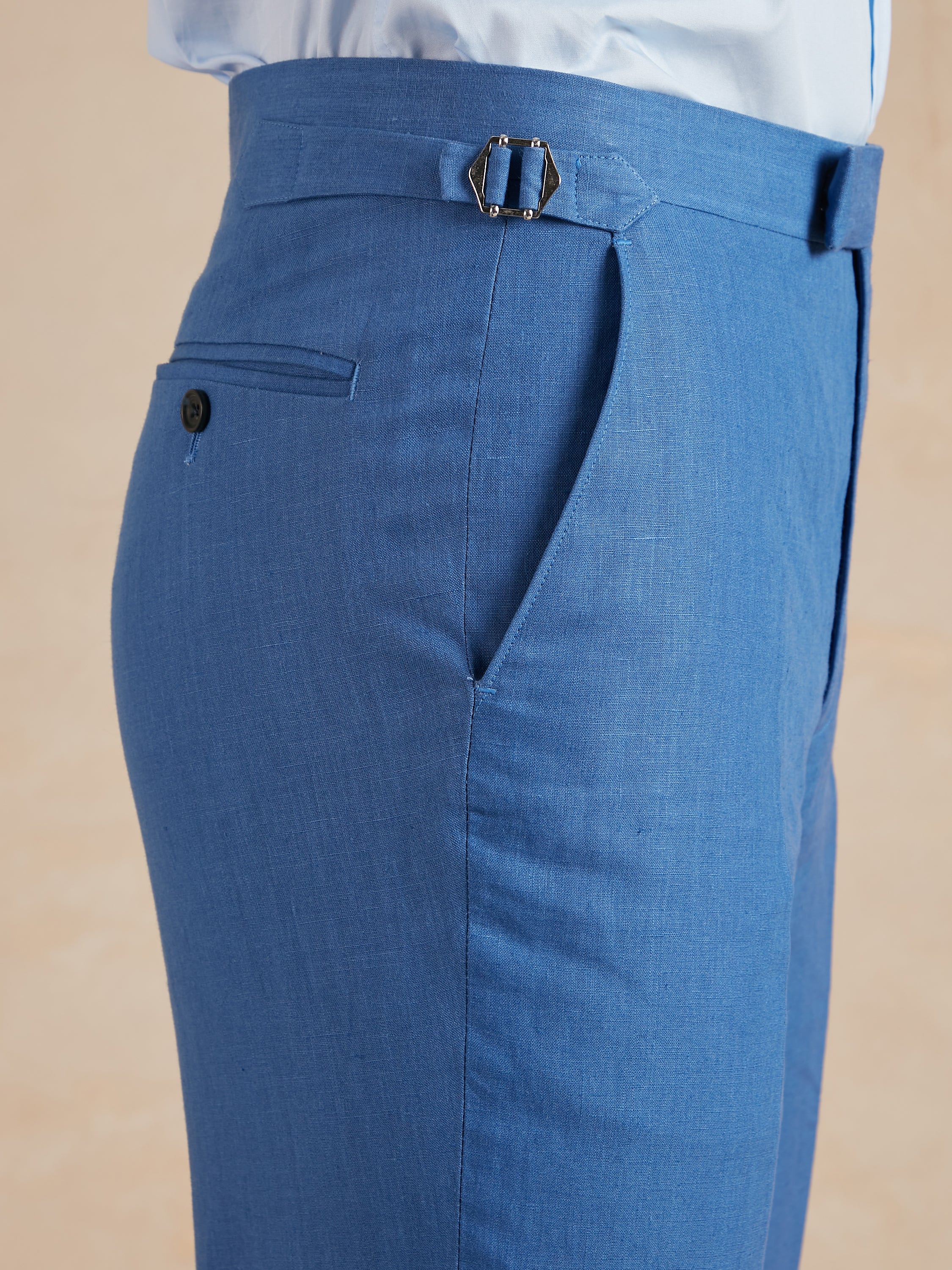 Ideal for summer, these cobalt blue flat front trousers are made of pure Irish linen, for unmatched comfort and style. Cut for a regular fit with a flat front, they feature slant pockets, side adjusters and a hook and bar tab for a clean look.