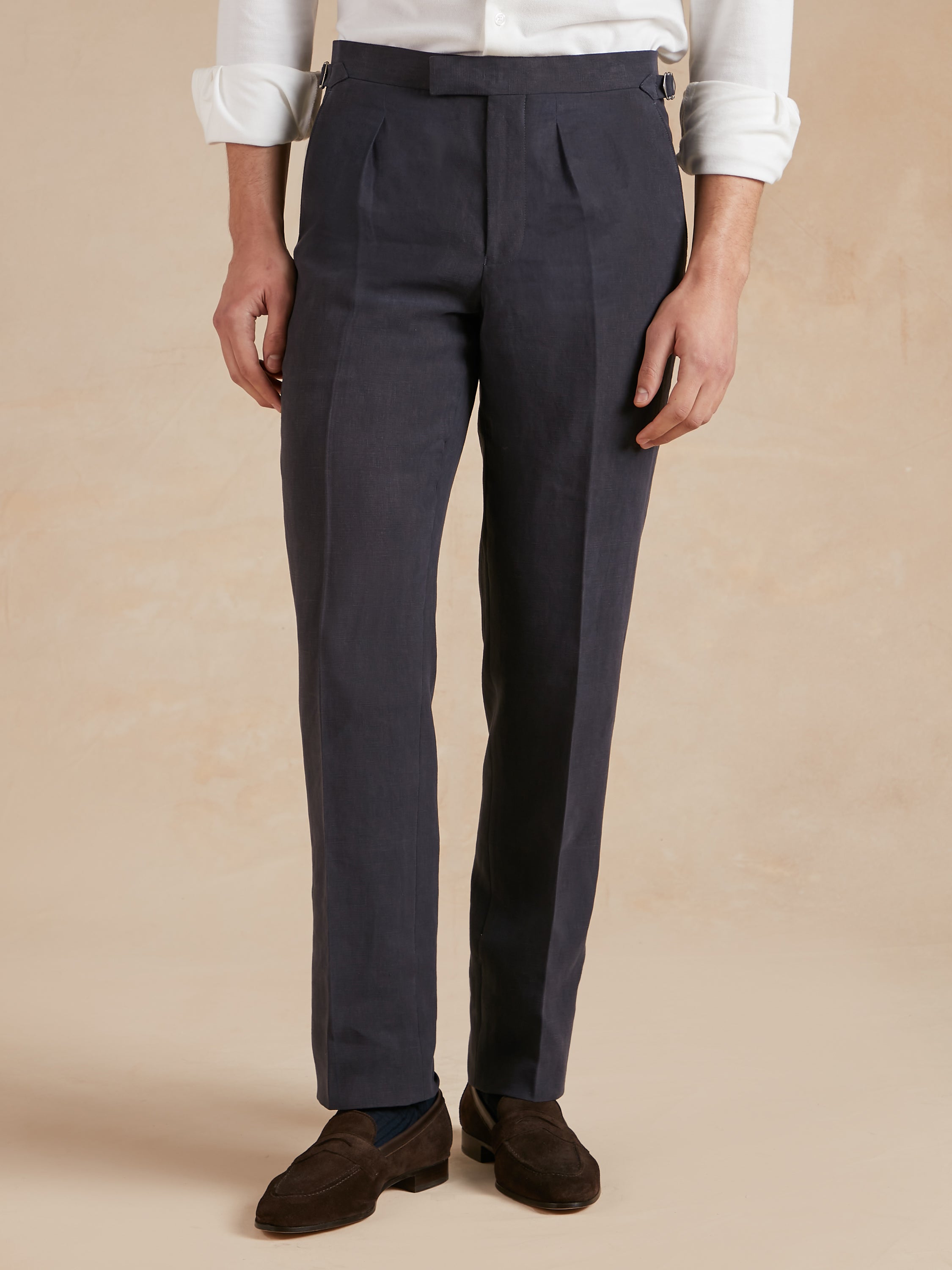 These classic suit trousers, in plain grey, are crafted from pure wool with a regular fit, single pleat front, side adjusters, and internal brace buttons. The classic pleated design and comfortable fit makes them ideal for both formal and professional occasions. Whether you are heading into the office or attending an event in the city, these suit trousers are the perfect option.