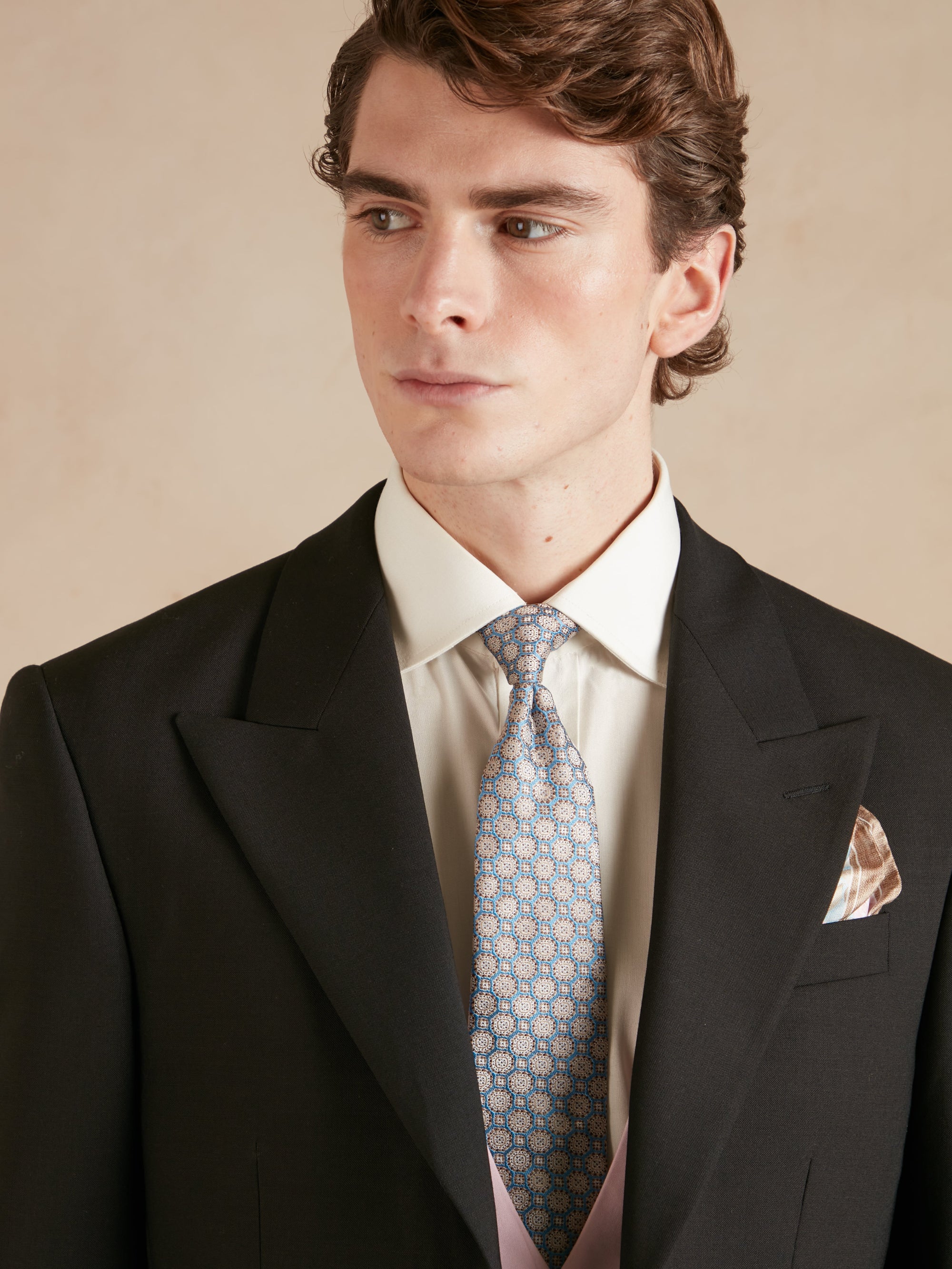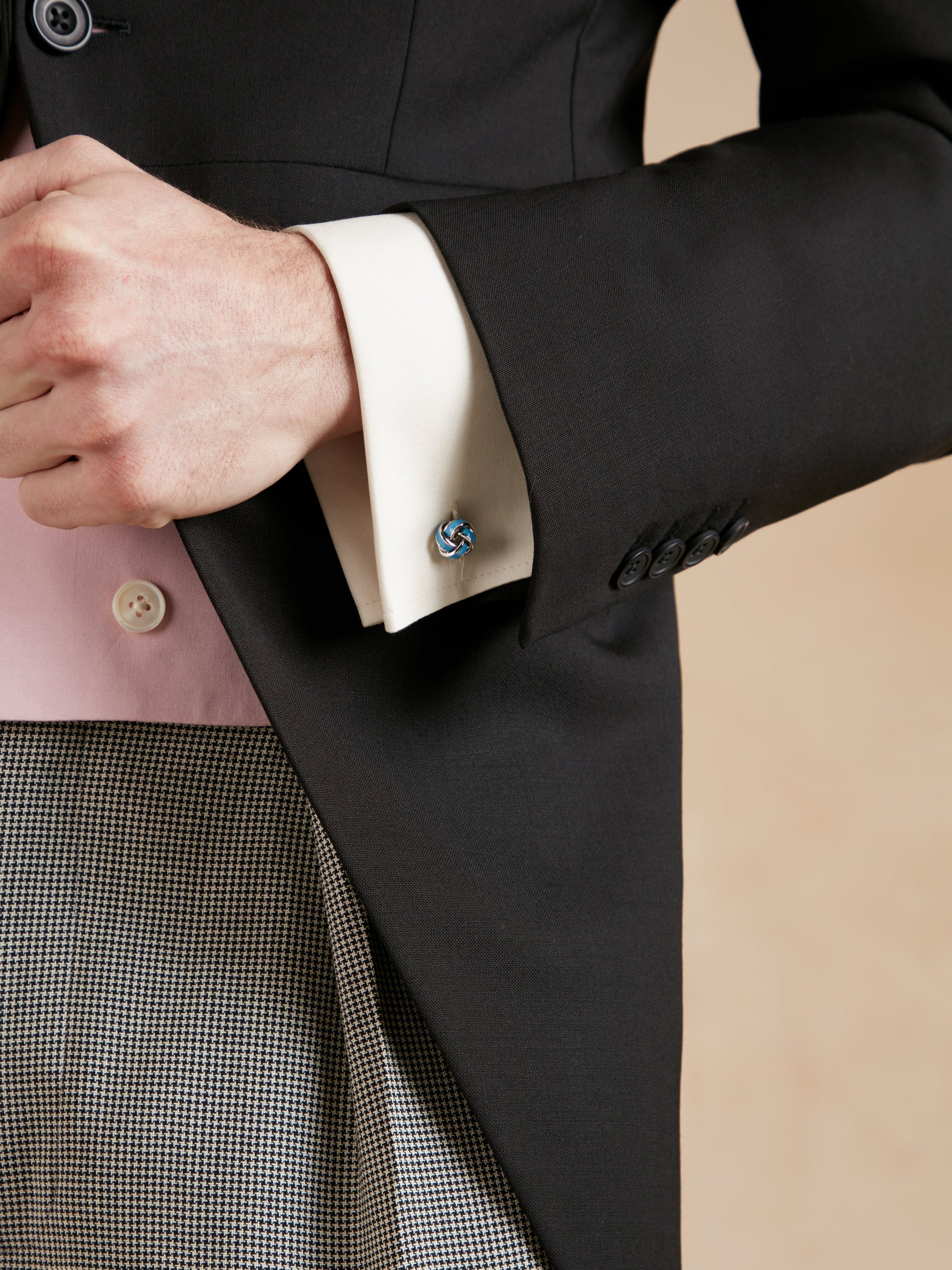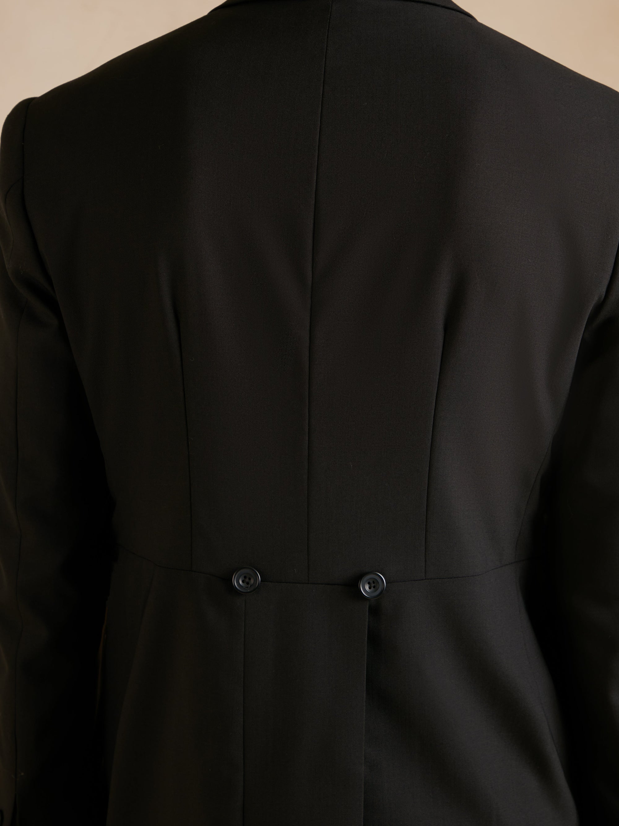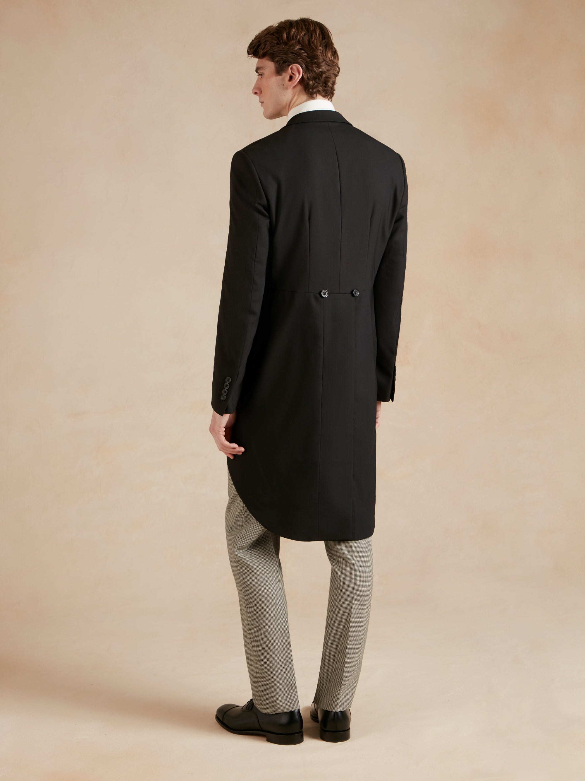 This fresco morning coat is Oliver Brown's newest morning wear addition. Crafted from 100% wool and supplied by renounced cloth supplier Huddersfield. The fabric is carefully sourced from renowned British mills, ensuring exceptional quality and durability. The traditional morning coat is descended from riding coats, but today this elegant attire is reserved for race meetings, and formal weddings and funerals. Classically cut, this black morning coat is crafted from pure wool.